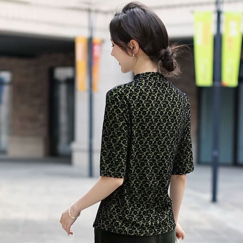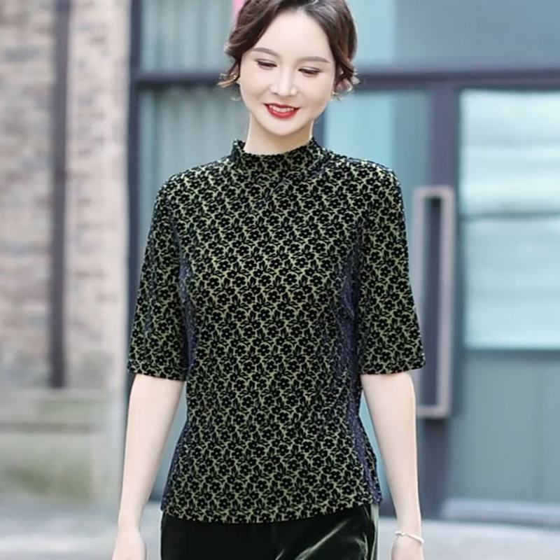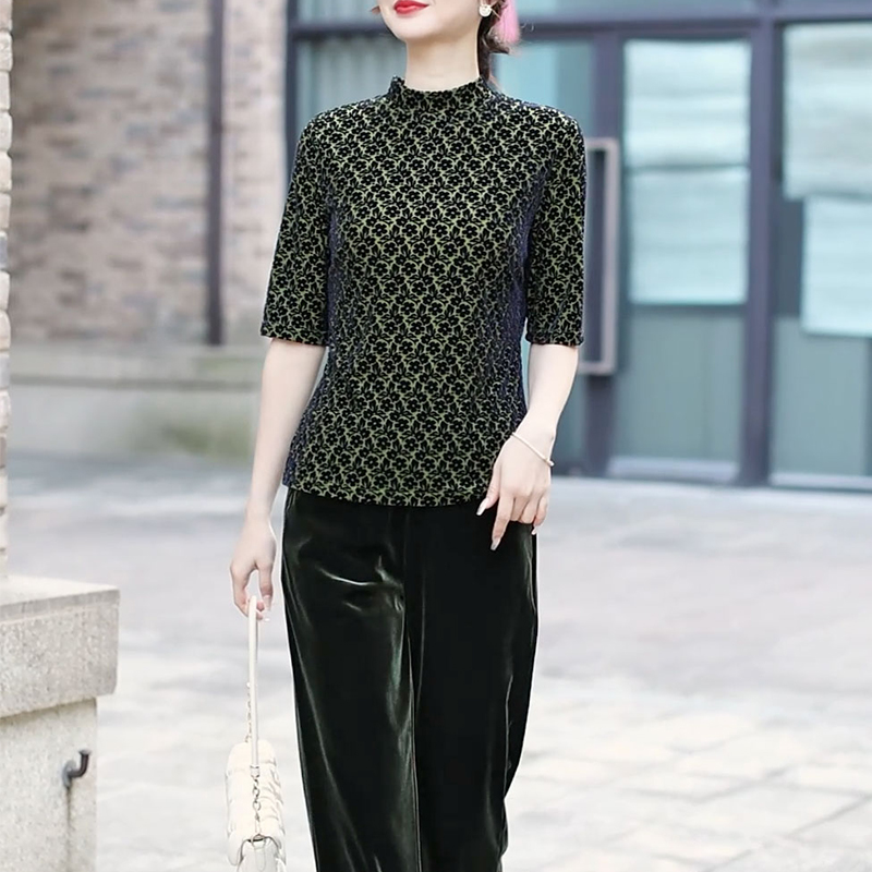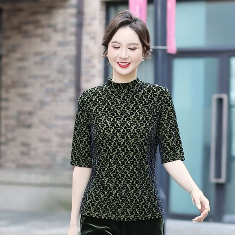 半高领的设计既修饰颈部线条,展现出优雅的气质,又能在微凉的天气带来温暖。中袖的长度恰到好处,方便活动且舒适自在。金丝绒的面料质感柔软,微微泛光,尽显奢华品质。无论是搭配黑色长裤展现干练,还是配上同色系的半身裙增添柔美,都能让穿着者轻松驾驭各种场合,演绎出低调而不失奢华的独特风格 。