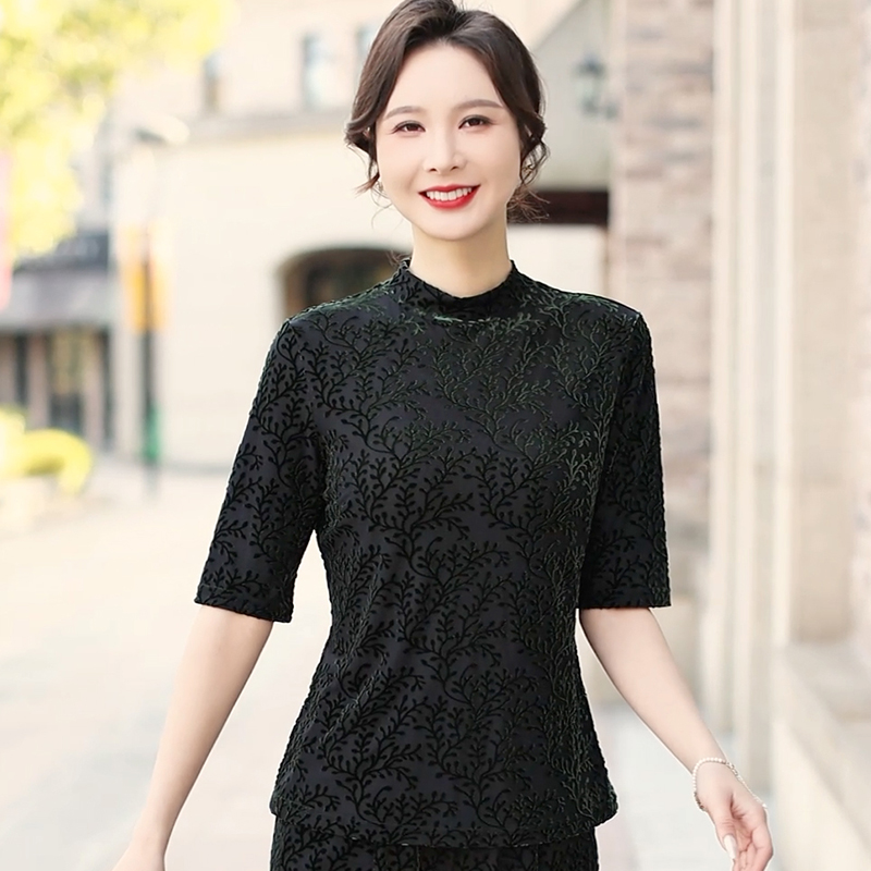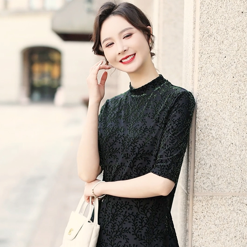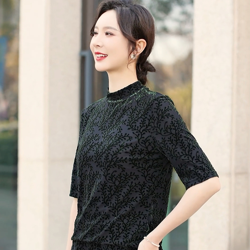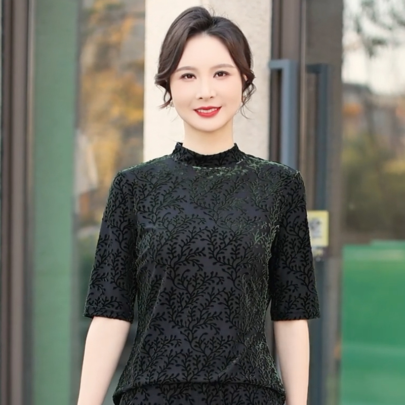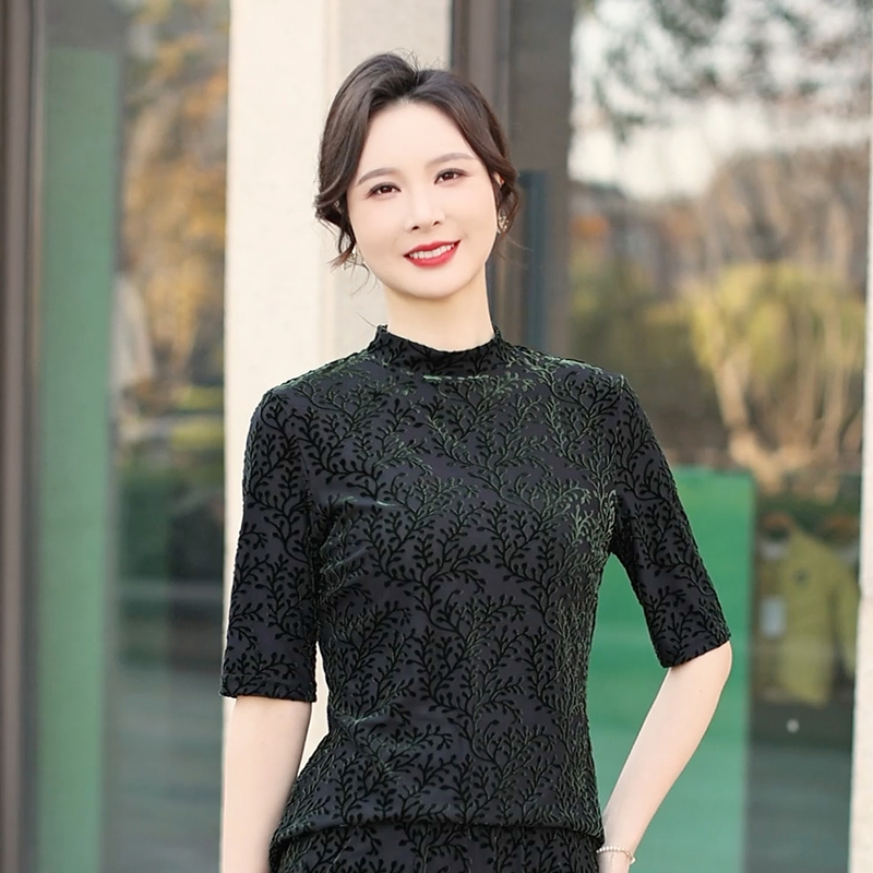 这件墨绿色中袖上衣,是复古与时尚交织的杰作。深沉的墨绿色,自带沉稳气质,仿佛蕴含着岁月的故事。细腻的花纹如藤蔓般舒展,为整体增添了灵动之感,恰似自然在衣袂上绘就的艺术画卷。半高领设计贴合颈部曲线,尽显优雅。无论是搭配简约下装漫步都市,还是出席重要场合,它都能让你于不经意间成为目光焦点,展现独特的品味与格调。