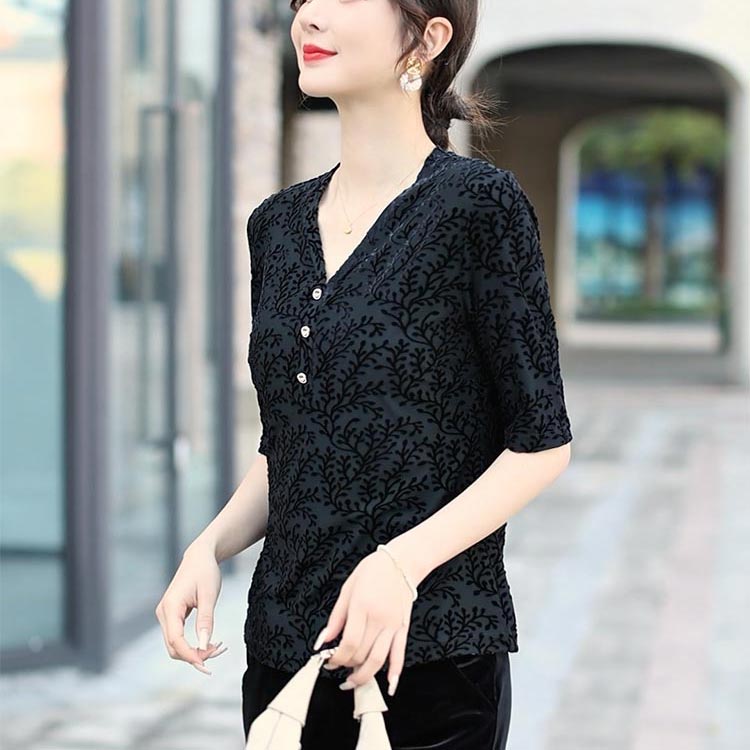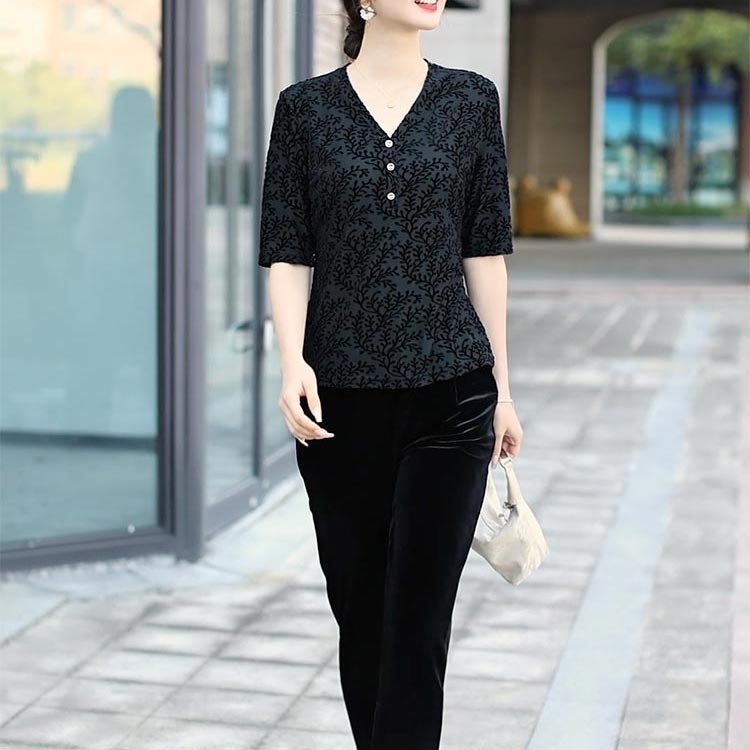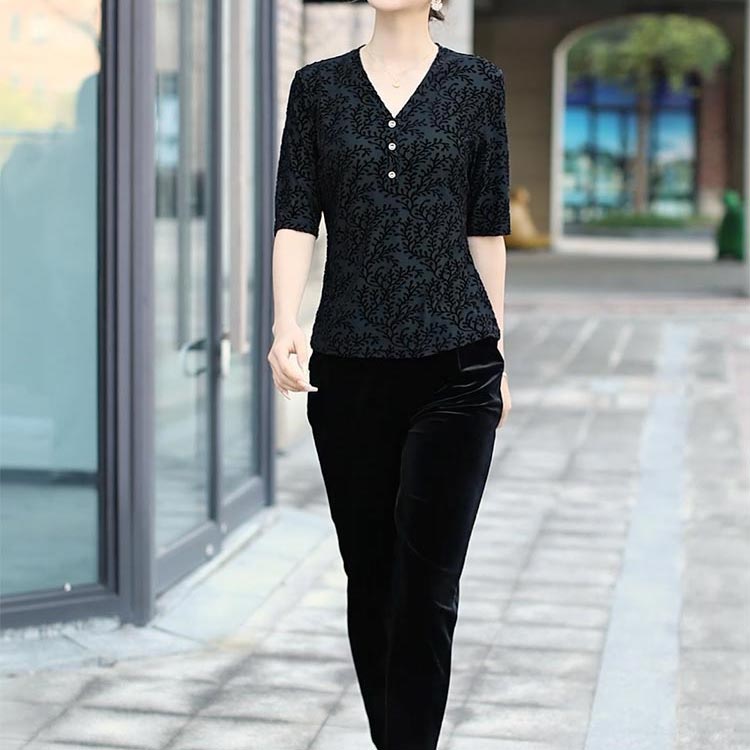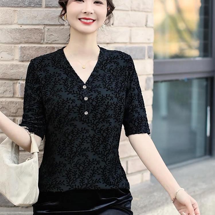 中年时尚新宠 | 黑色提花 V 领中袖上衣