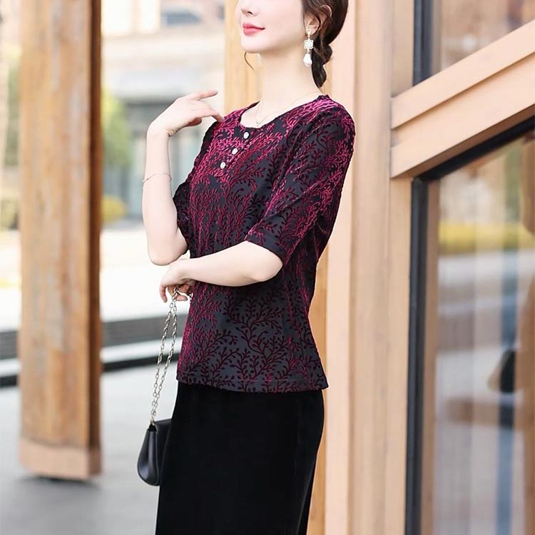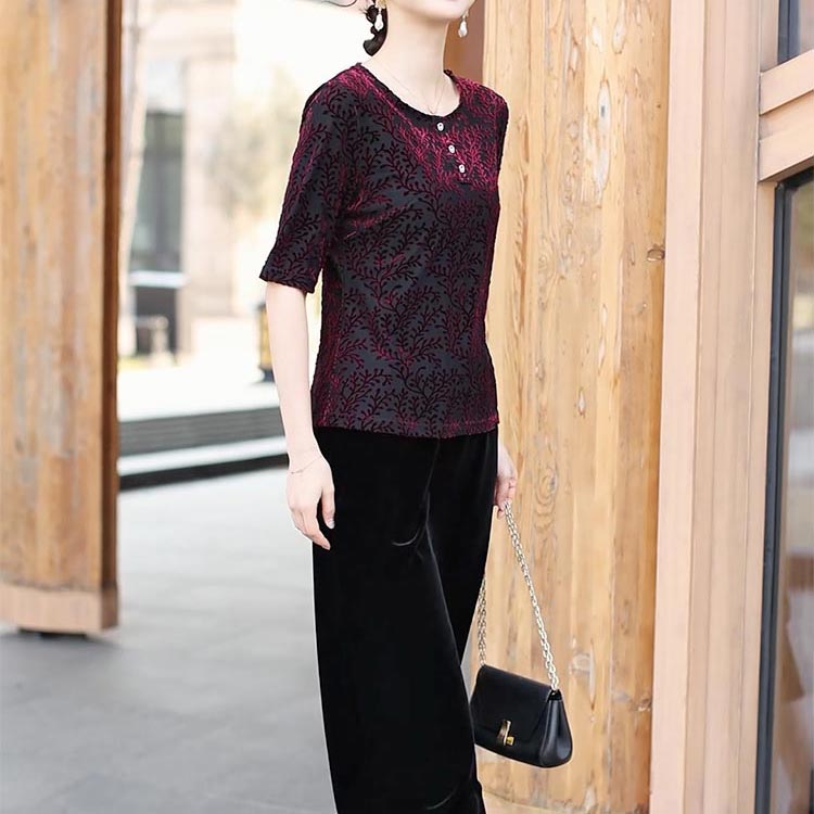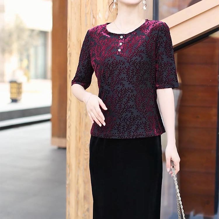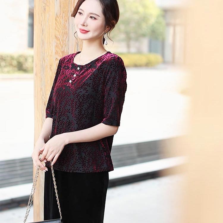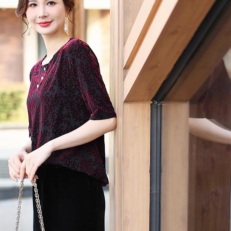 宝子们,一定要试试这件红黑丝绒上衣!丝绒面料质感超绝,红黑交织的植物花纹,复古又奢华。中袖设计修饰手臂线条,圆领搭配精致纽扣,细节感满满。