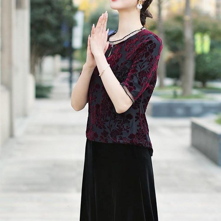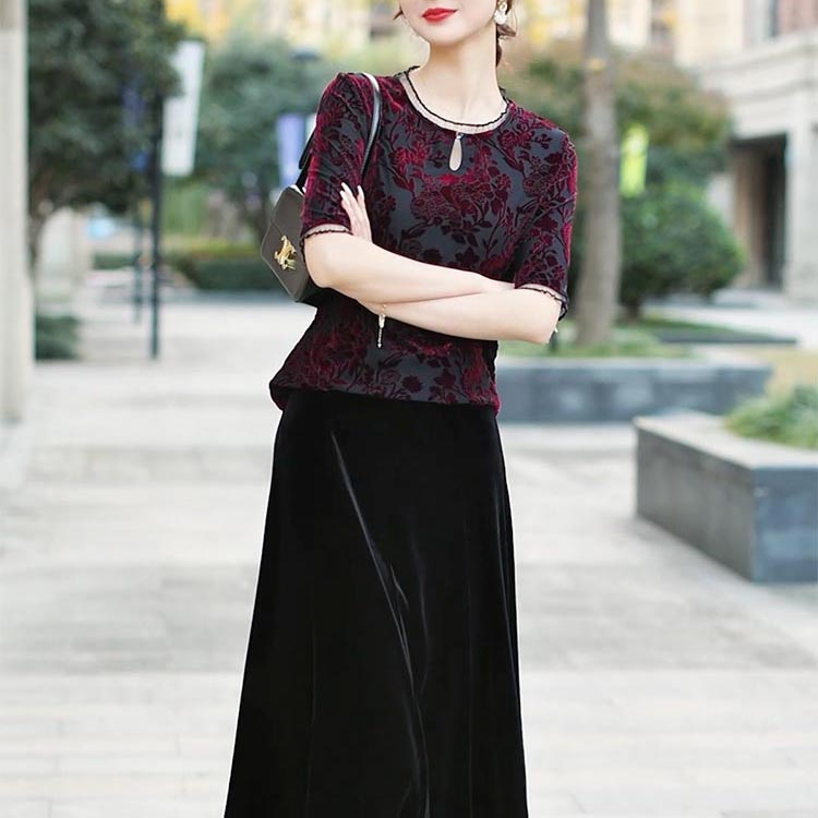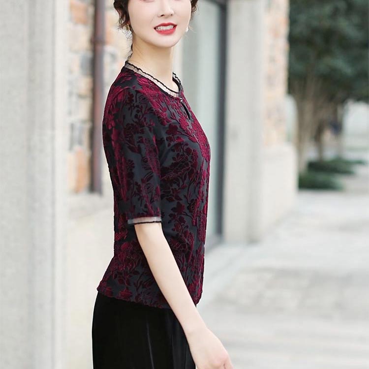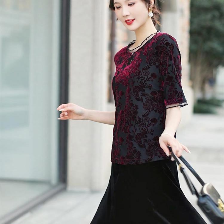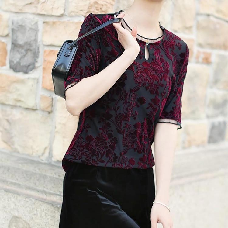 宝子们,这件酒红色植绒短袖上衣太惊艳啦!精致的植绒花纹,细腻又华丽,酒红色浓郁又高贵,衬得肤色超美。